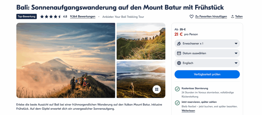 Mit unglaublichen 9364 Bewertungen und einem Schnitt von 4,8 Sternen, könnt Ihr für nur 21€ pro Person den Sonnenaufgang genießen und traditionelles balinesiches Essen genießen!